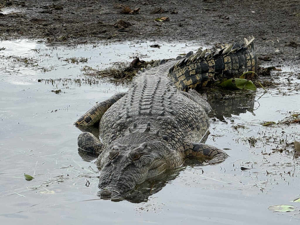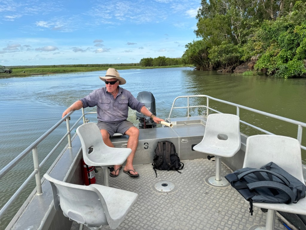After lunch and a long, cooling swim in the pool, we joined Sab for a fishing excursion in the nearest billabong. Sab had us outfitted for catching barramundi. The three of us cast out hundreds of times and got only one nibble at the end of the day, but nothing that stayed on the line. While fishing we enjoyed looking at many water lillies and a few large crocks lounging on the shoreline. As the sun went down, we enjoyed a beer, still hoping for a catch. It was almost dark when we gave up on fishing and motored to the beach head.