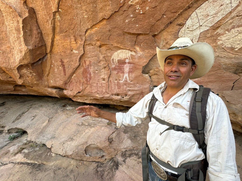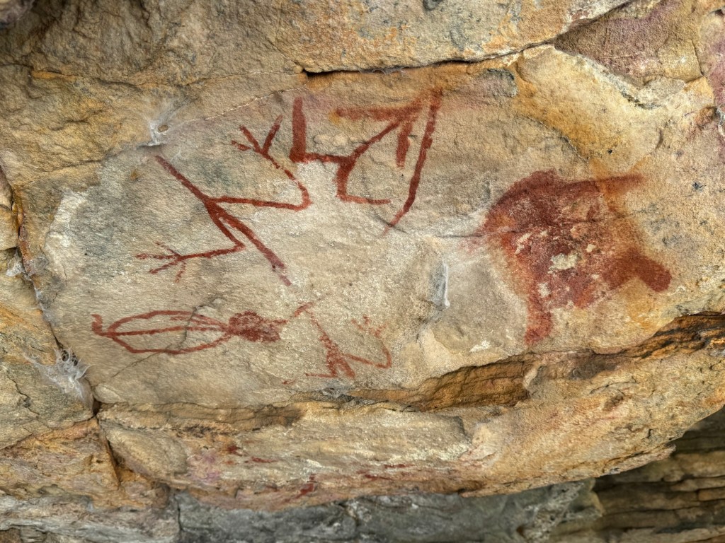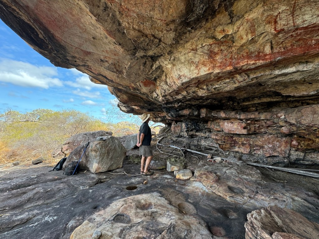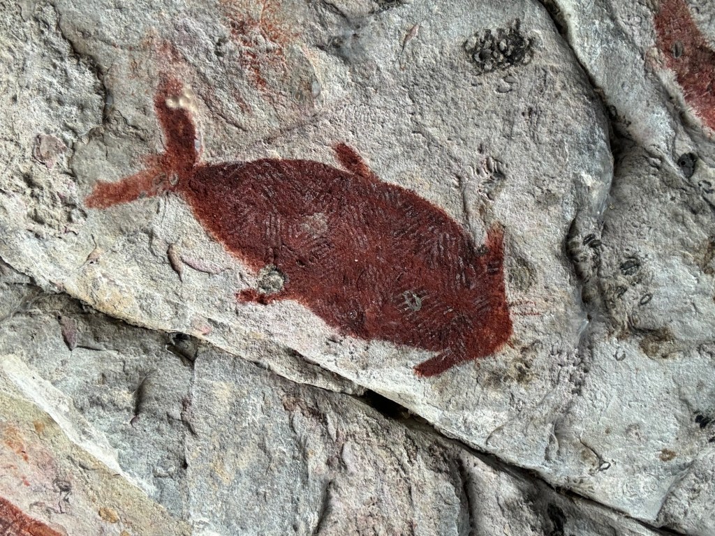 Rock formation holding Left Hand GalleryLeft Hand GalleryA large turtleFishLong neck turtleMark looking up at art with human bones nearbyInside a caveDwelling area Contact artRubbing two rocks together to get red pigment for painting
