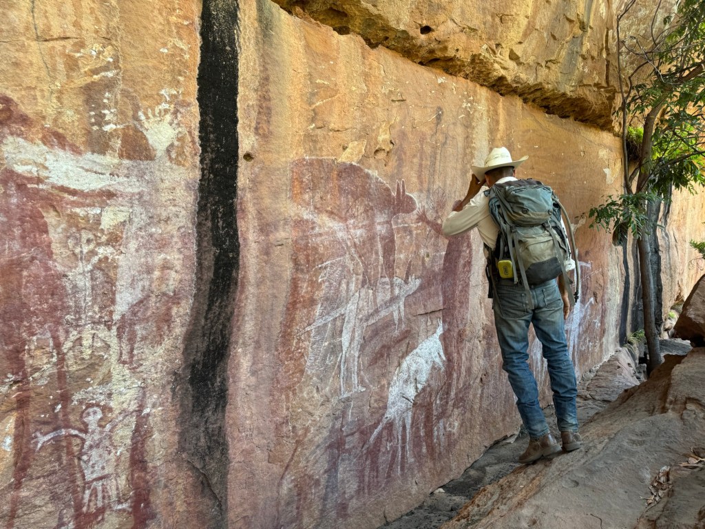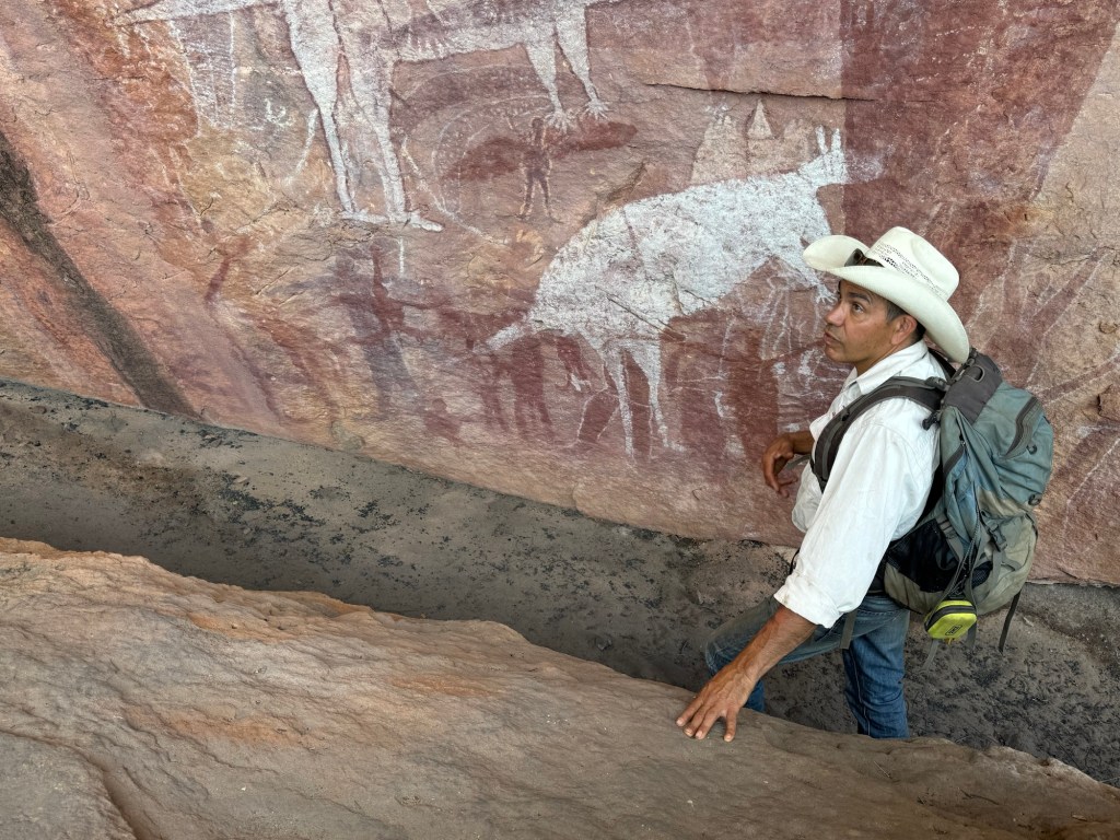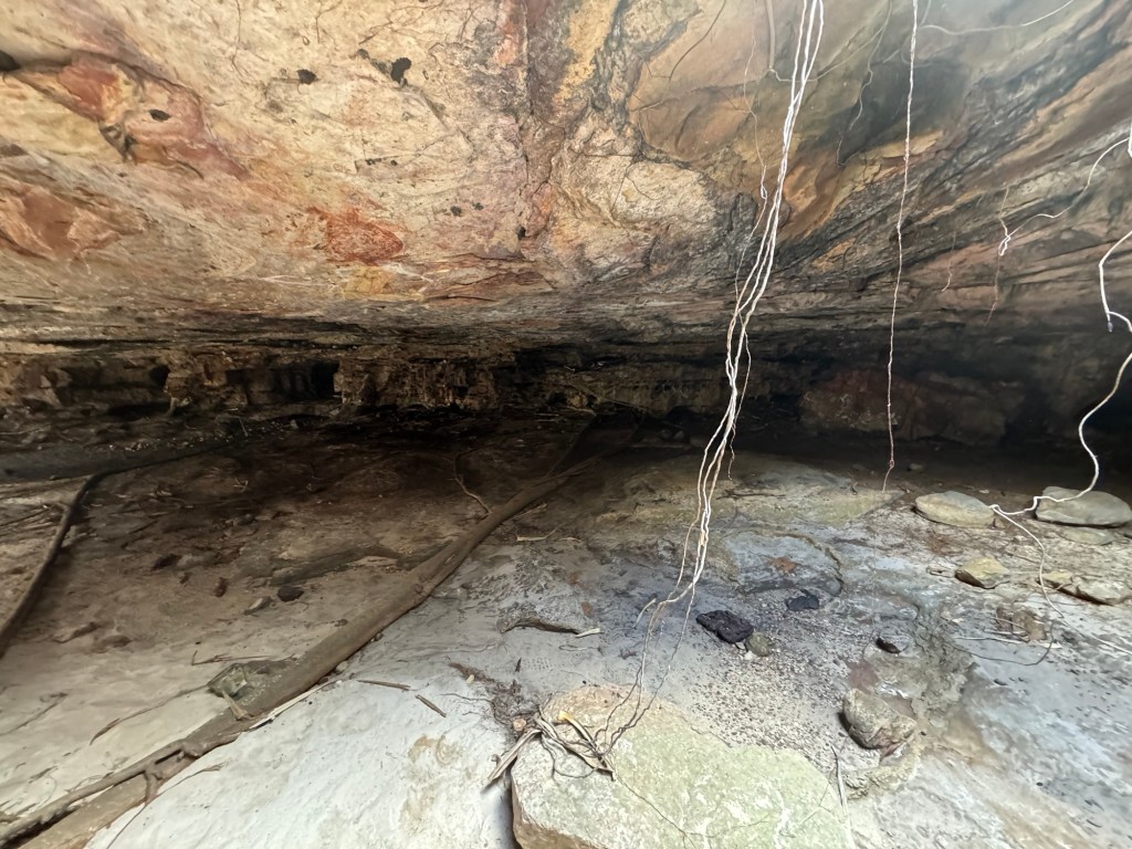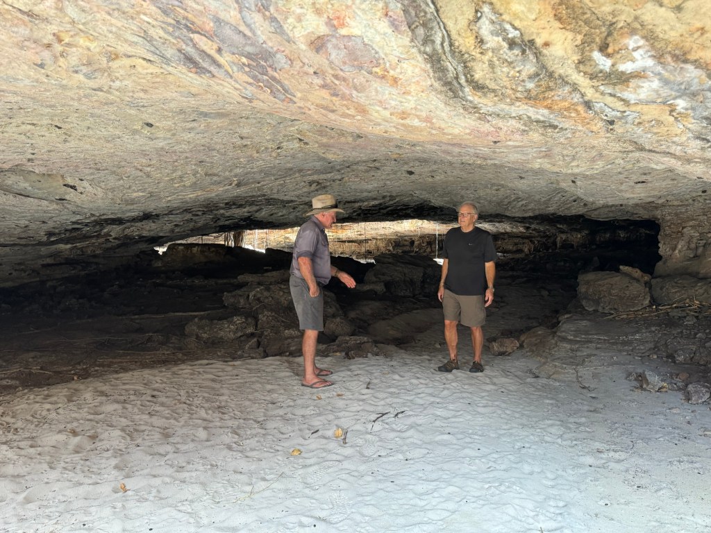 Rock formation holding Left Hand GalleryLeft Hand GalleryA large turtleFishLong neck turtleMark looking up at art with human bones nearbyInside a caveDwelling area Contact artRubbing two rocks together to get red pigment for painting