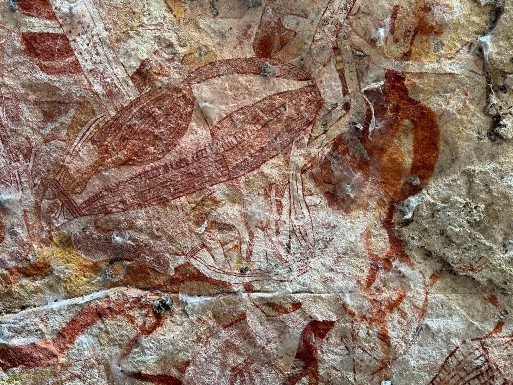 Shortly we stopped at a beach head, from which we could walk to the “Left hand Gallery”, named that for the “Left hand Billabong” it is near. It was an easy walk to the art gallery, which was also a burial site and an aboriginal dwelling site. The art was as beautiful as other sites we have seen, however the burial site and dwelling area were much larger.