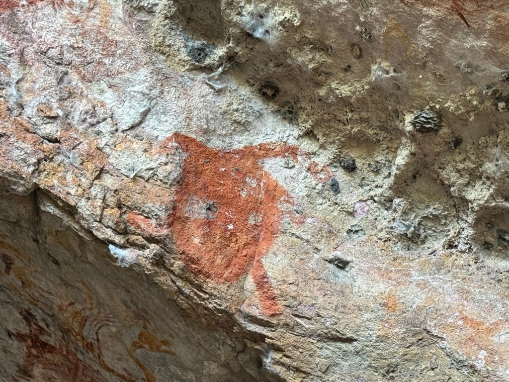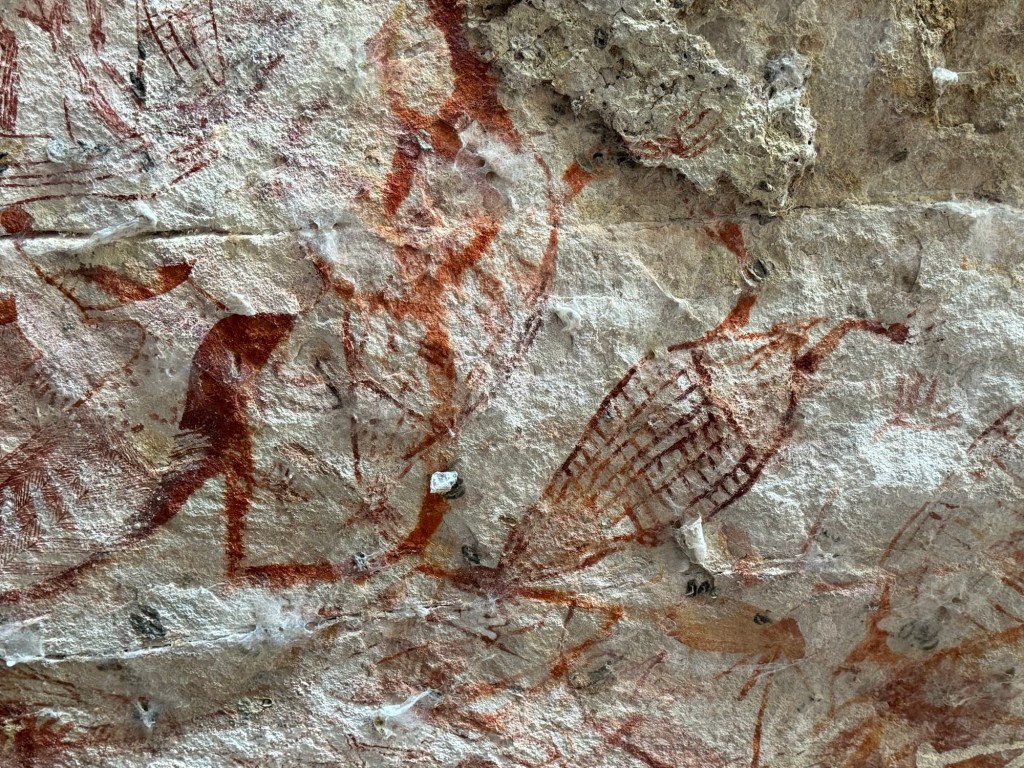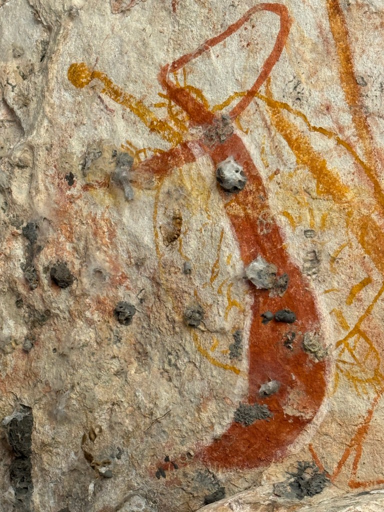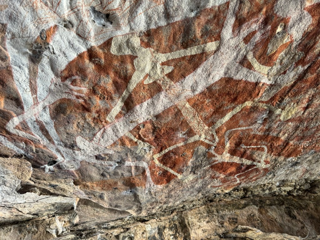 Then we drive to the nearest helicopter pad a few miles away and flew about an hour to a place called Jerramali, which means “thunderstorms”to meet another couple who are friends of Cathy. This couple belong to the western Yalanji people, “people that belong to this place”. They are Johnie, his wife Erica and their three children. There are thousands who belong to this group of people. Johnie will be showing us the traditional art gallery on his property. He has an old utility ATV that he uses to take people close to the art site. It is a scary ride, but better than walking. Anyway, there is still more boulder walking after exiting the vehicle before we are finally at the art gallery. Johnie is pretty good at explaining the figures. What I notice is that the drawings are different in style and color and shape from the art in the Arnhem collection. Here are samples from the art wall.