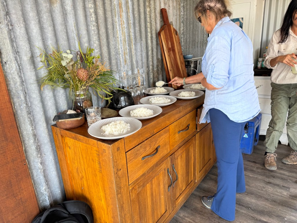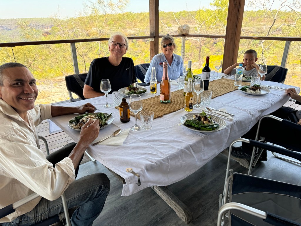 The big wallA dingo on left Cathy dishes up lunchLunch is served in Johnie’s 3 sided corogated building with a concrete outhouseMark poses with Johnie’s family & the helicopterPort Douglas in the distance