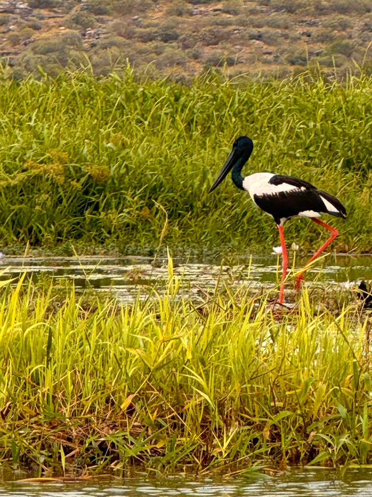 In the afternoon, we were back in the Land Rover heading in another direction to a Billabong (body of water), where we got into a flat-bottom, aluminum, pontoon boat and motored slowly between water lilies and crocodiles looking at Ibis, Jakibu, and a rare bird called a rile. Unfortunately, I cut off its nose. The site was called Mt Borradaile by the aborigines, pronounced Bordilo by white people, and had many lovely works of art.