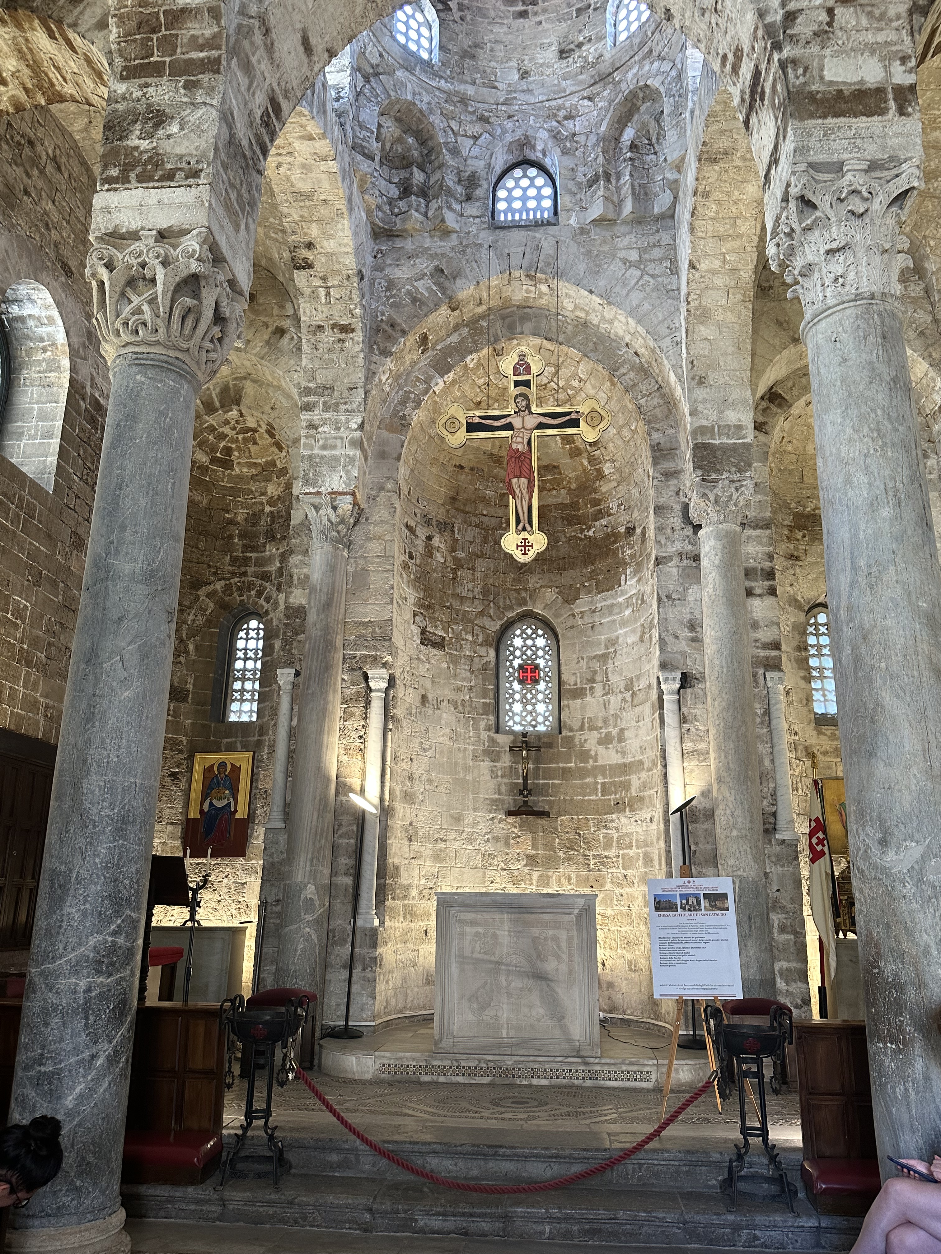We changed, ate a fast lunch and drove in several cars to Syracuse for a walking tour led by Terry. It included Greek antiquities in the middle of the modern city, the ancient city walls, the large and lovely Piazza Duomo and the Cathedral, which had originally been a Greek temple, later replaced by a muslim mosque and finally by the Roman Catholic Church . We attended Mass in the Cathedral at 7pm and dinner at a nearby reserved restaurant at 8pm. The food was terrific. All went as planned by Terry. Love that boy.