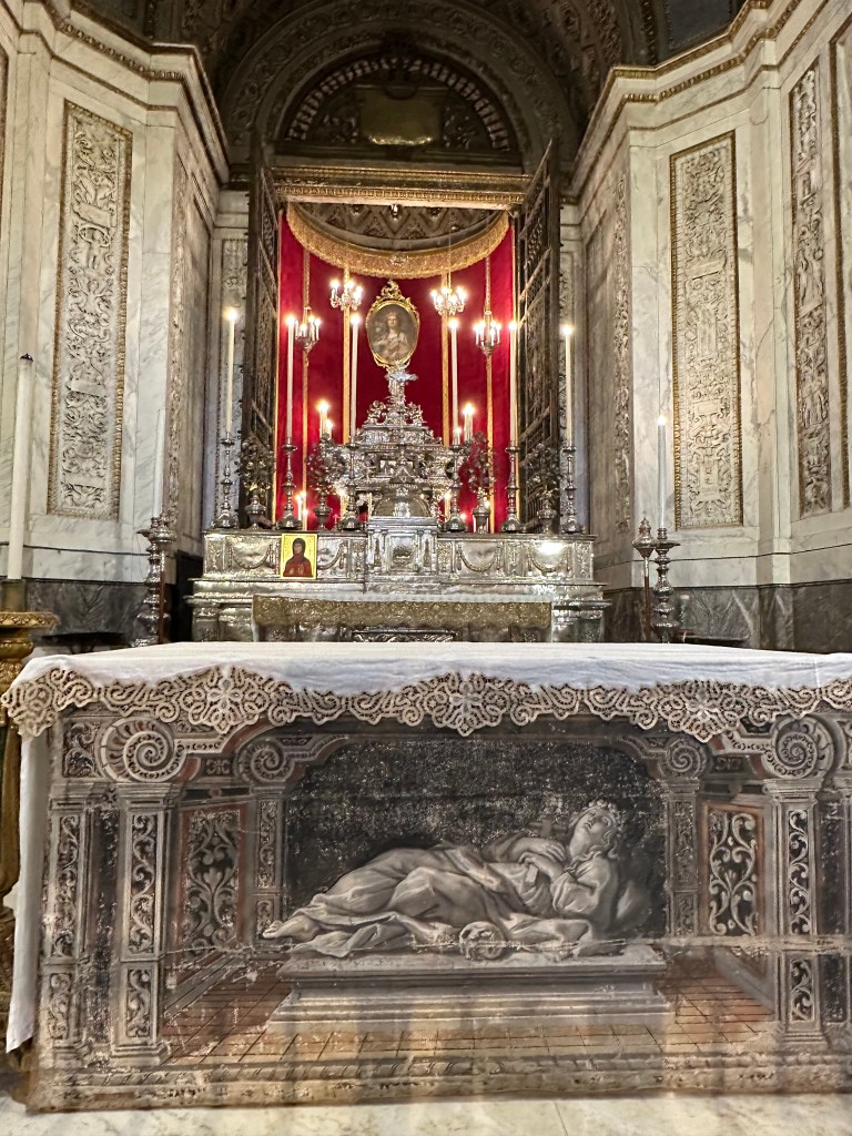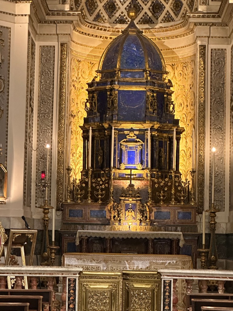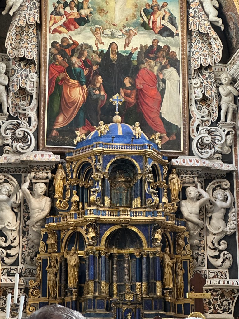 Inside the basilica the main alter looks a bit like St Peter’s in Rome. The church is very decorated and painted.