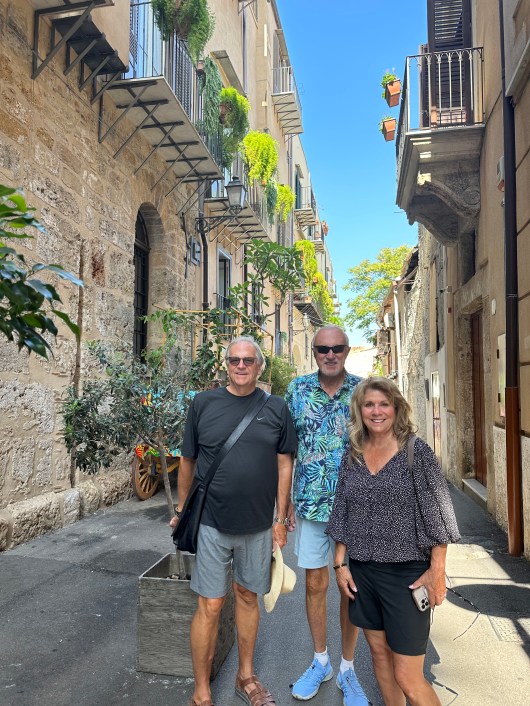 By 7:30 we gathered in the courtyard for dinner. The villa staff provided us with a delicious buffet with typical Sicilian dishes. The sky sprinkled on us and most of us moved under cover. Al Dover gave a lovely welcome thank you to Mark and me for hosting the week. It was very touching. Then I talked about housekeeping matters and Terry McAteer talked about the planned activities for the week. I was thrilled that everyone had arrived safely and were already enjoying themselves. Success. We had been so busy chatting that we forgot to take photos. Sorry.
