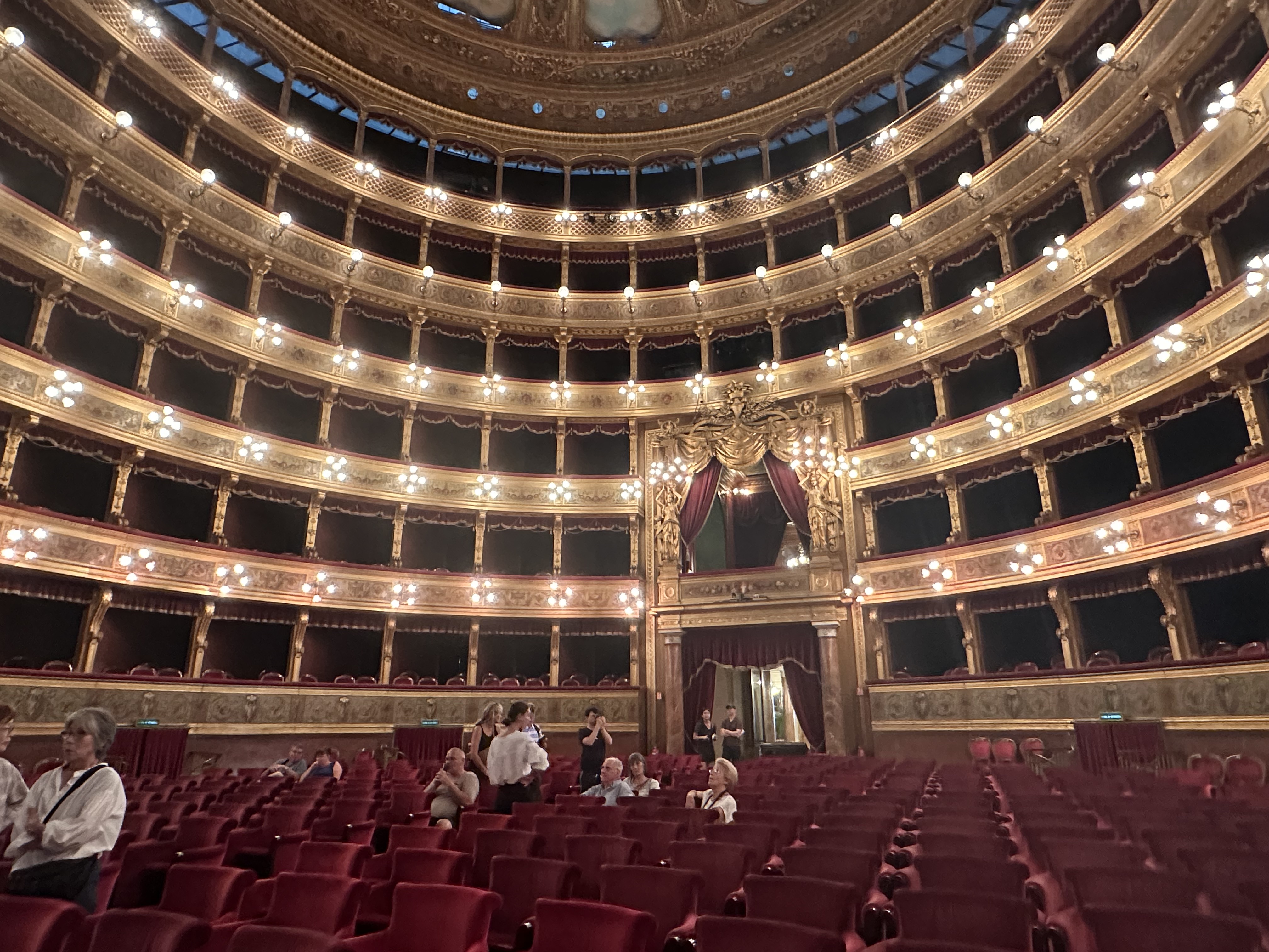 Midtown, we reached the private home we were scheduled to tour and met the owner. Once we were all assembled, he walked us up a large central staircase into the formal rooms of the palatial home. We were invited to inspect the ball room, drawing room, dining room and an office space. We saw paintings and photographs of his relatives going back 5 generations, a ball gown worn by a great grandmother, several Venetian glass chandeliers, several generations of furniture. His parents still live in the half of the house he did not show us. His ancestors had been aristocrats, and public figures in the community. It was an interesting tour that lasted about 45 minutes. Then he pushed us out the door as he had an Italian group coming right behind us. I suspected this was his way of paying for the maintenance of the property, but it looked quite neglected